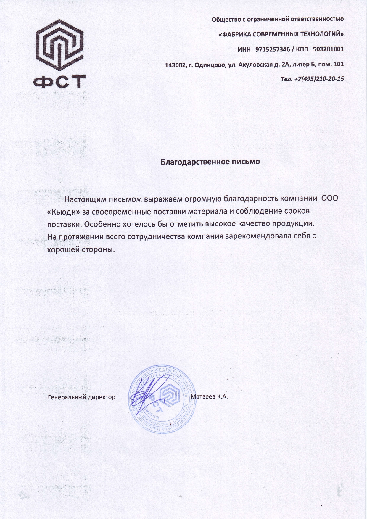 Компания ООО “Кьюди” - современное предприятие, располагающее новейшим высокопроизводительным оборудованием, соответствующее мировым стандартам качества выпускаемой продукции и организации производства. Мы производим и продаем только товары высшего качества и дарим клиентам положительные впечатления.